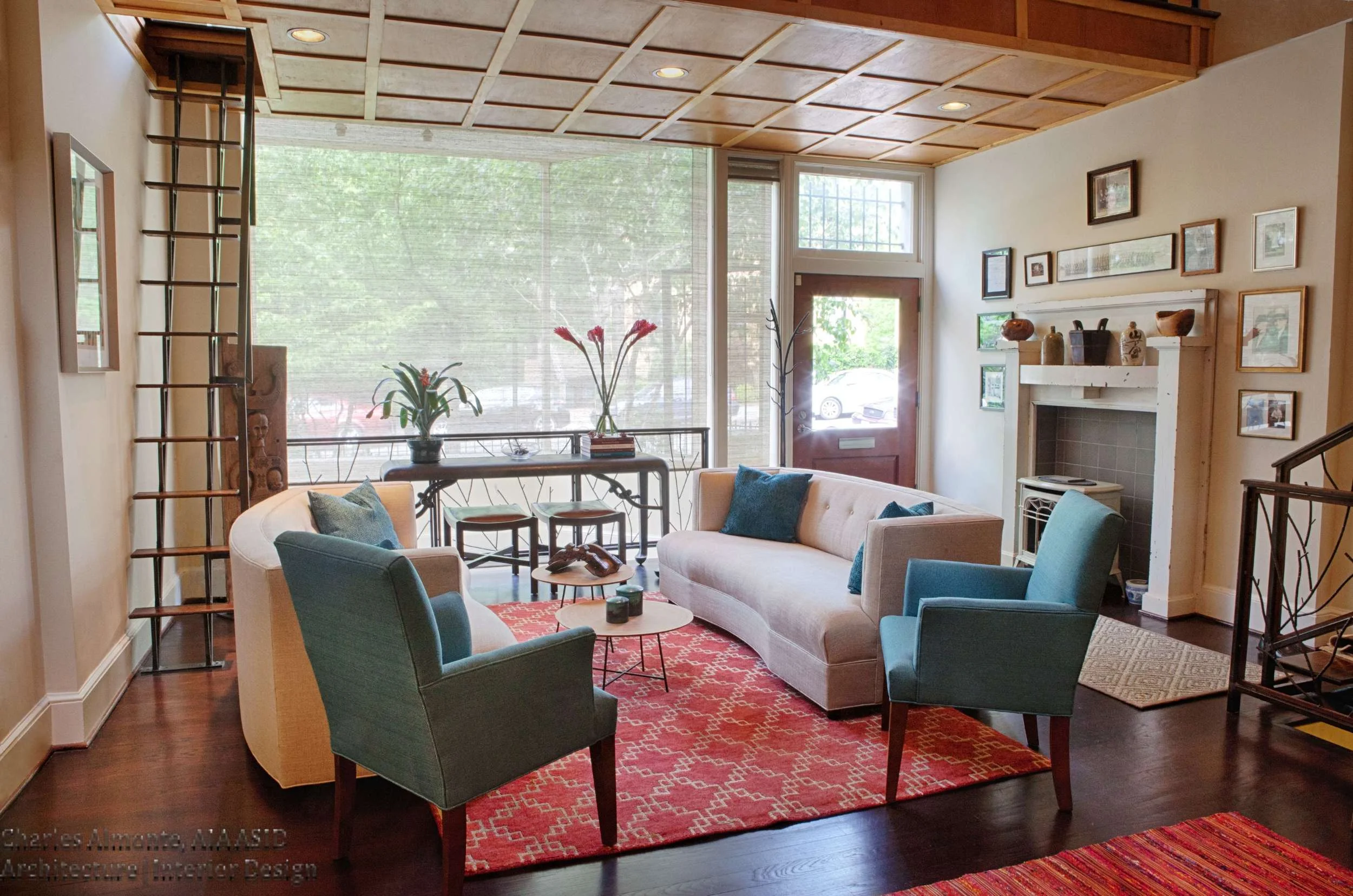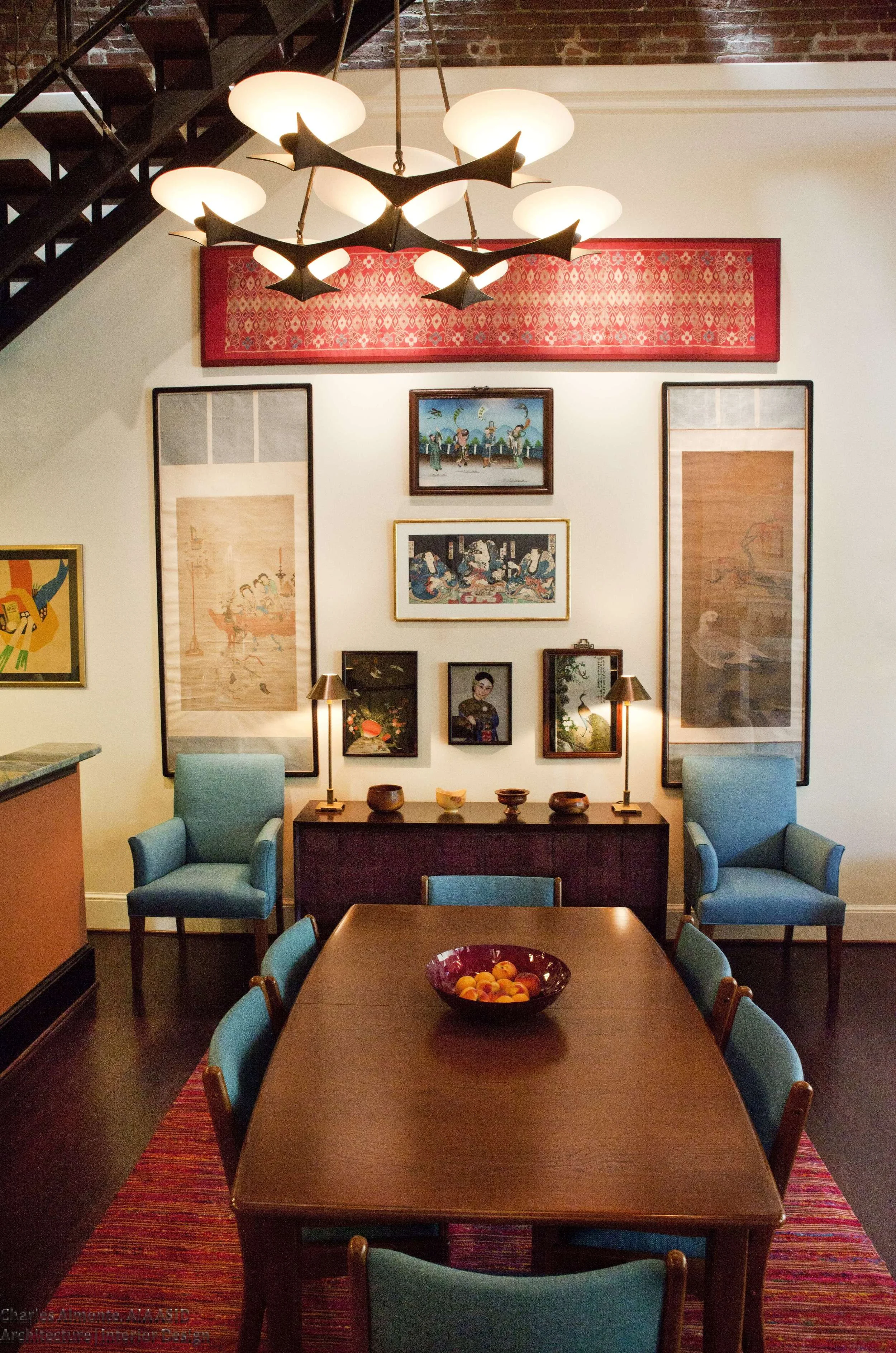 Our studio used careful furniture selection and placement to define the living and dining areas without creating visual and architectural barriers. This allowed our clients to continue enjoying the view of their front yard and daylight coming through the. The vibrant colors, patterns and textures of their Asian, African and Middle Eastern art collection provided inspirations for the materials, colors and fabric selections.