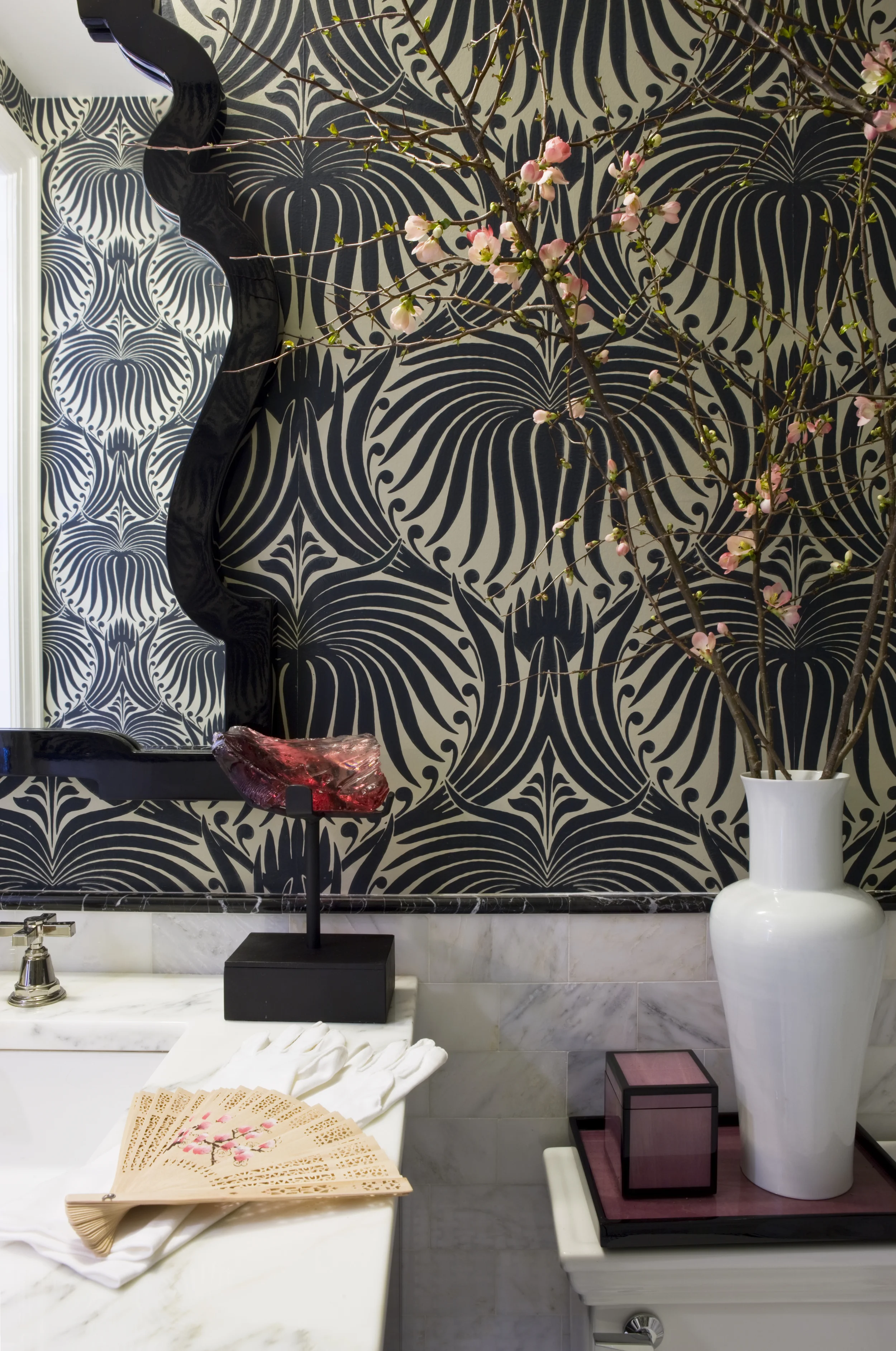 The bold stylized feather pattern of the wallpaper by Farrow and Ball and the contrasting black and white color scheme creates a classic dramatic mood in this jewel box of a powder room. Playing off the black and white color scheme are the basket weave patterned floor tiles and white marble wainscoting capped with a black marble bullnosed trim. Hints of amethyst colored accents provide an elegant spark of color.